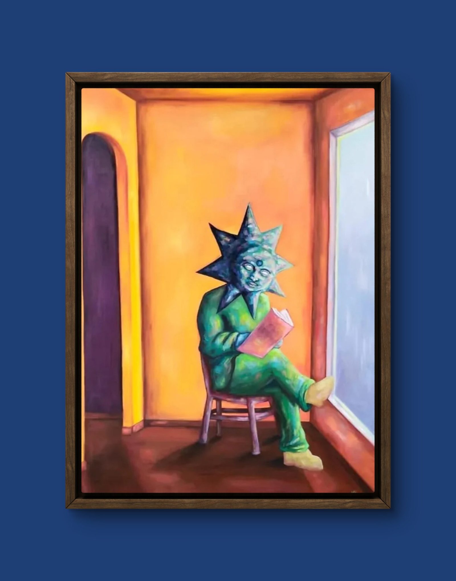 Un sol lee tranquilamente un libro junto a la ventana, pero en esta escena aparente de calma se esconde una verdad más cruda. Parte de la serie El agotamiento de la cotidianeidad, esta obra revela cómo incluso en momentos de placer o descanso, el peso de la rutina puede opacar la luz interior. Las ventanas —símbolo de esperanza— observan desde el otro lado, como si esperaran que despertemos a una vida más sensible, más viva. Hay mucho más de lo que se ve: una tristeza silenciosa envuelta en luz dorada.