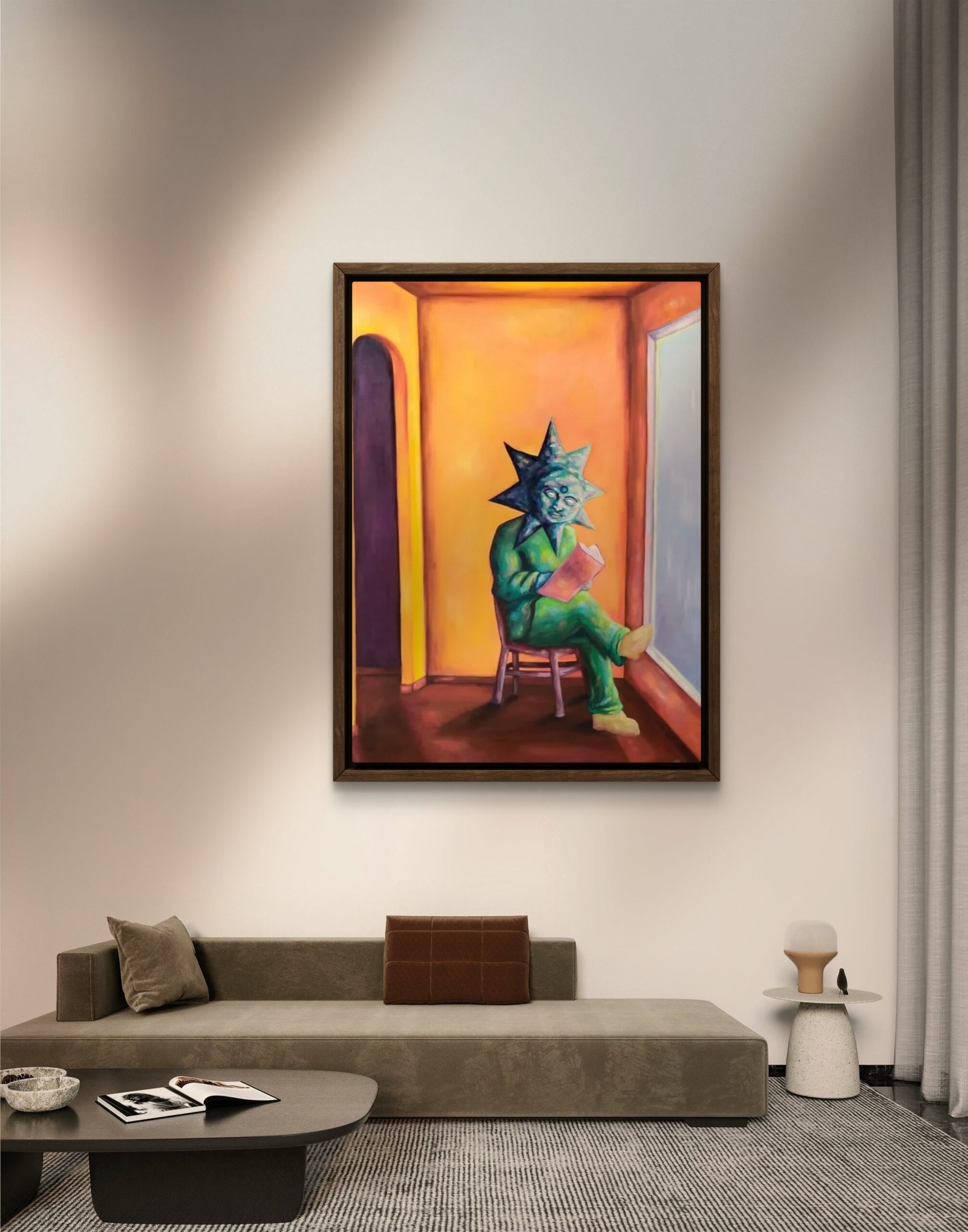 Obra de la serie El agotamiento de la cotidianeidad que retrata una calma aparente cargada de melancolía. Un sol lector simboliza cómo la rutina puede apagar la luz interior, incluso en momentos de descanso.